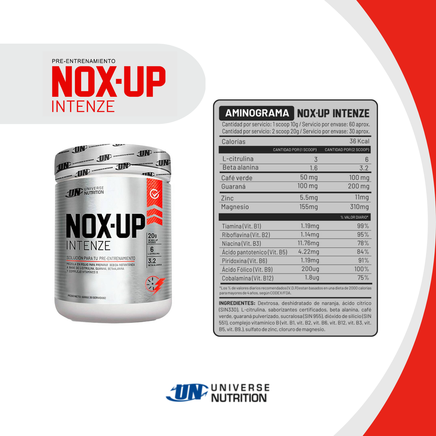 Re-formulado para nuestros clientes más exigentes, NOX UP INTENZE es el siguiente paso en la evolución de los pre-workouts. NOX UP INTENZE es un pre entrenamiento completo con energía insuperable, mayor intensidad y fuerza incomparable, ¡Te colocará en una zona de entrenamiento diferente a todo lo que hayas experimentado antes!